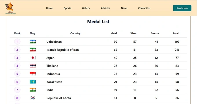 Сборная Узбекистана завершила V молодёжные Параазиатские игры со 187 медалями — 99 золотыми, 57 серебряными и 41 бронзовой, заняв первое место в общекомандном зачёте, сообщил Национальный олимпийский комитет.
