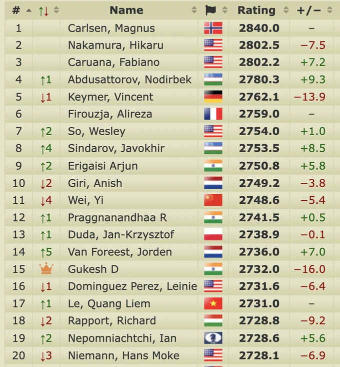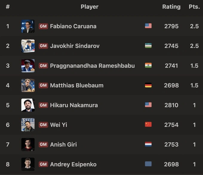 Успешное выступление также отразилось на рейтинге узбекистанца. По итогам партии его показатель достиг 2753,5, что позволило Синдарову подняться на 8-е место в мировом рейтинге — это лучший результат в его карьере.