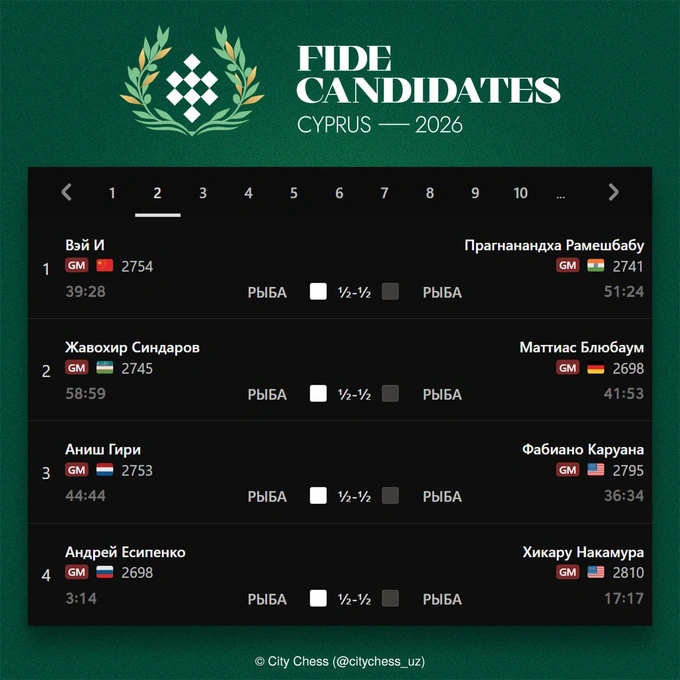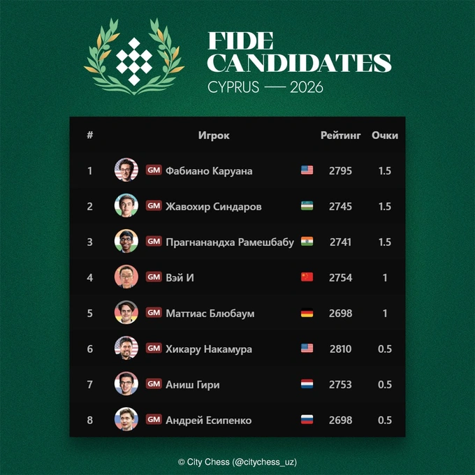 Турнир претендентов проходит с 29 марта по 15 апреля на Кипре. Победитель соревнования получит право сыграть матч за мировую шахматную корону против действующего чемпиона мира Гукеш Доммараджу.