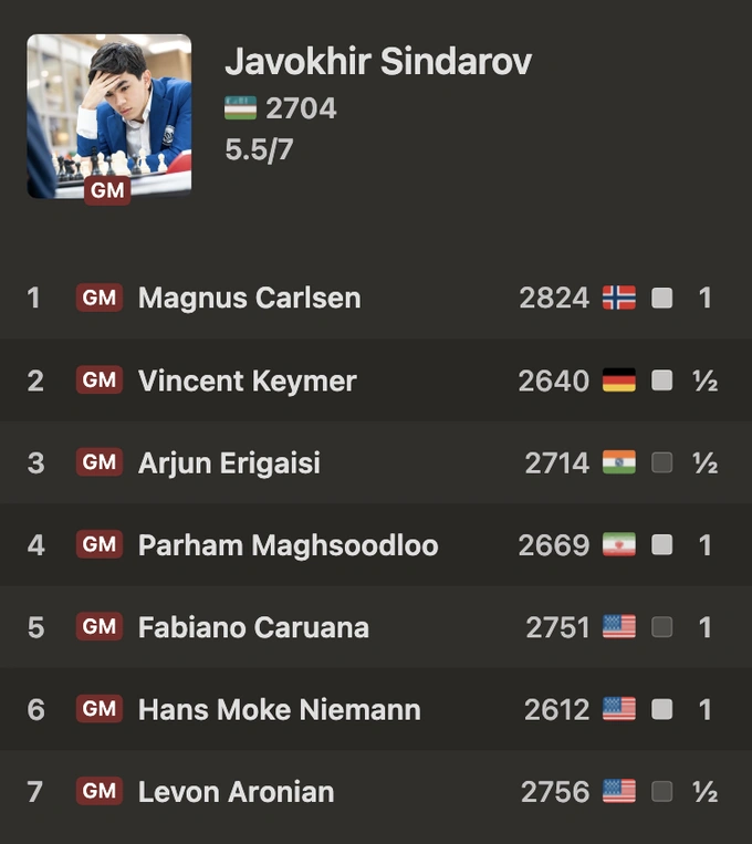 После этого Синдаров сделал две ничьи — с Винсентом Каймером и Арджуном Эригайси (обе партии были крайне острыми и завершились вечным шахом), — а затем оформил хет-трик побед.