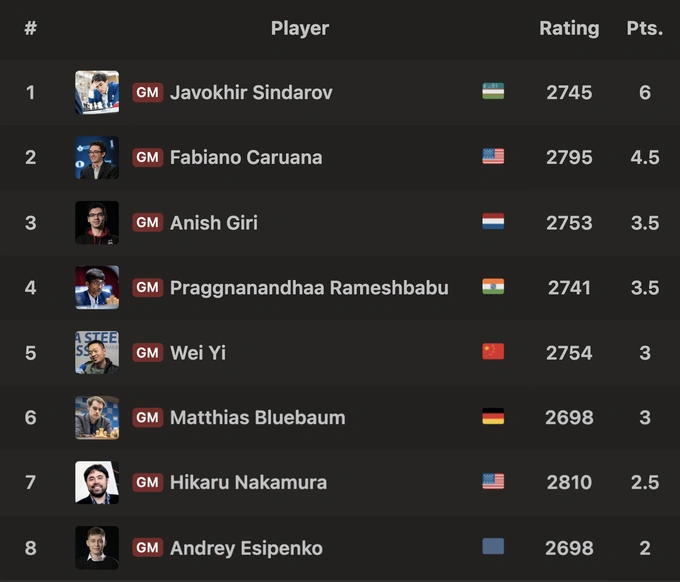 Восьмой тур состоится 7 апреля после дня отдыха в понедельник. В нём Синдаров сыграет с Андреем Есипенко чёрными фигурами.