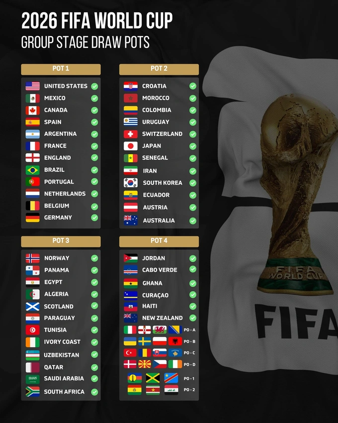 К настоящему моменту участие в чемпионате гарантировали 42 сборные. Ещё шесть команд определятся в стыковых матчах, которые пройдут в конце марта 2026 года. Они автоматически попадут в четвёртую корзину.