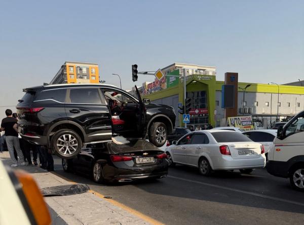 Узбекистан, Ташкент – АН Podrobno.uz. На улице Махтумкули в Ташкенте произошло необычное ДТП: Chery оказалась на крыше Malibu. Судя по видео из соцсетей, кроссовер вынесло с противоположной полосы.