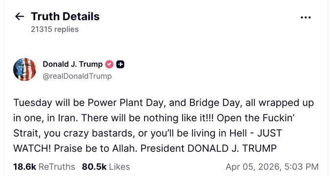 5 апреля президент США опубликовал содержащий нецензурную лексику пост с угрозами разрушить иранские электростанции и мосты, если Ормузский пролив не будет открыт. «Вторник будет днём электростанций и днём мостов в Иране одновременно. Такого никогда ещё не было!!! Открывайте чёртов пролив, сумасшедшие ублюдки, иначе вы будете жить в аду. Вот увидите!» — написал Трамп.